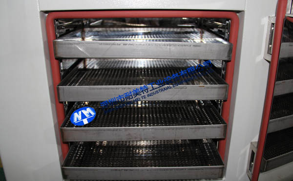 2、內膽部分:內膽材質采用1.5㎜厚SUS304#鏡面不銹鋼板制做,不生銹,耐腐蝕,易清洗,使爐內清潔、無塵。內膽尺寸:寬0.45米,高0.45米,深0.35米,內膽四周鋪100mm厚高溫硅酸隔熱棉,門邊四周增加耐高溫密封硅膠,使爐外溫度不燙手。烤箱左側裝有進氮氣孔和排氮氣口,配有玻璃流量轉子器。